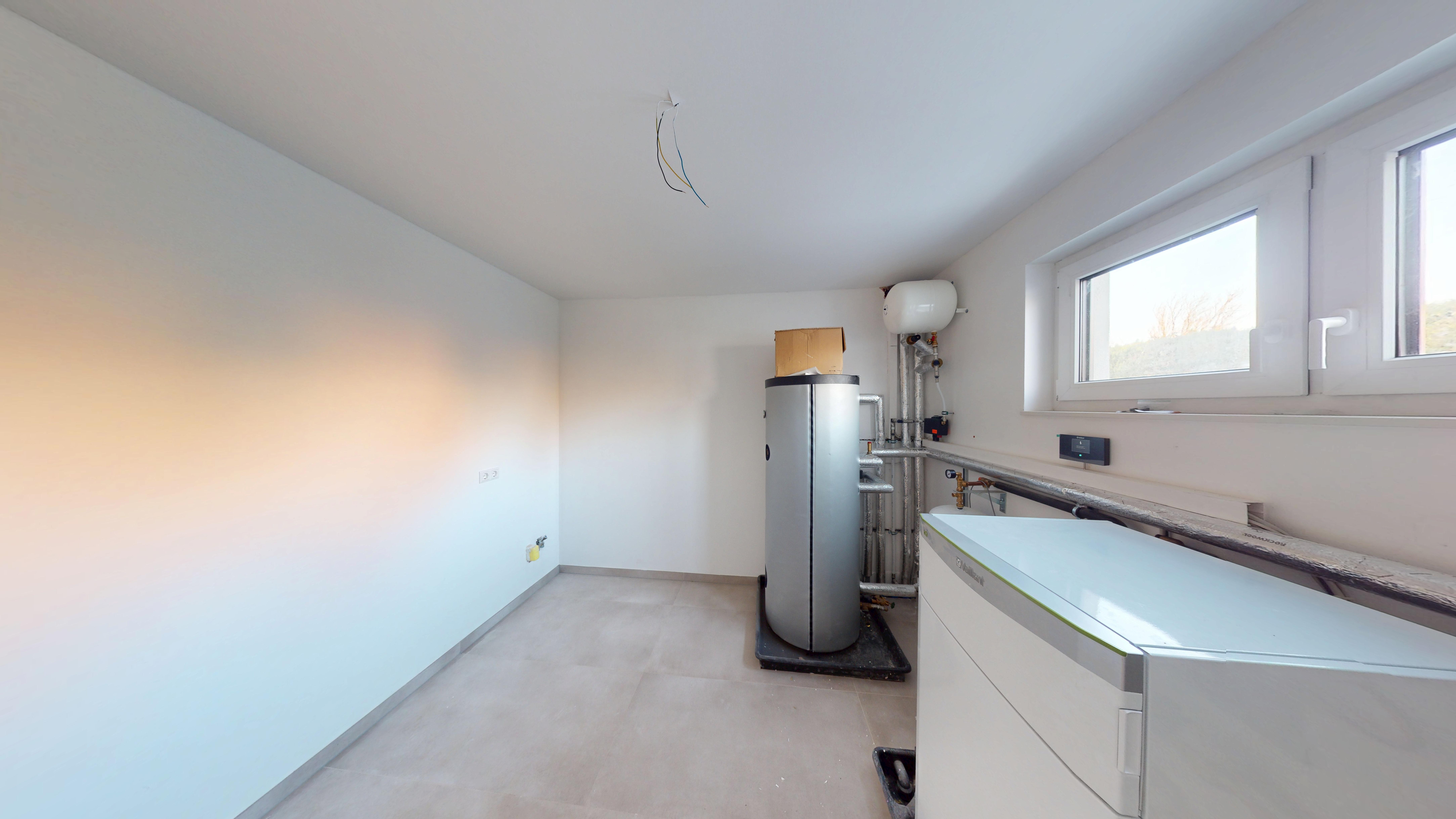 Die Doppelhaushälfte ist in massiver Bauweise errichtet worden und überzeugt durch einen hohen Qualitätsstandard. Beheizt wird die Immobilie durch eine effiziente Luft-Wasser-Wärmepumpe der Marke Vaillant, Typ Flexo-Therm mit einer Heizleistung von 5,3 kW.